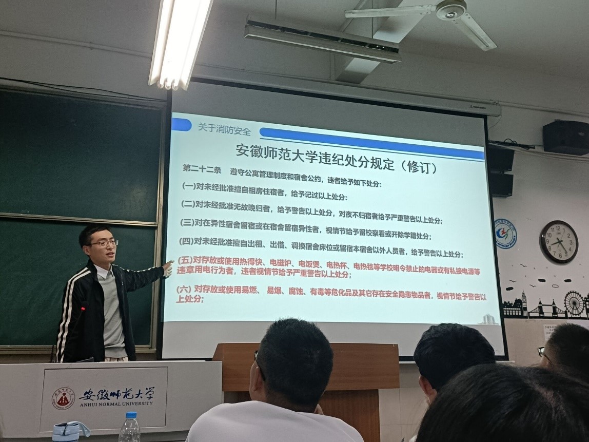 首先,韩红豆带领同学们学习了《安徽师范大学违纪处分规定》,使同学们对学校学生管理规定有了更深入了解,以便在今后学习和生活中做到认真遵守校规校纪,自觉规范日常言行。