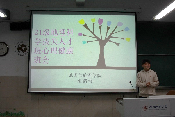班会分为两个流程,首先,张彦哲以心理健康电影片段作为导入,并就电影做出解读,引入了班会的主题。
