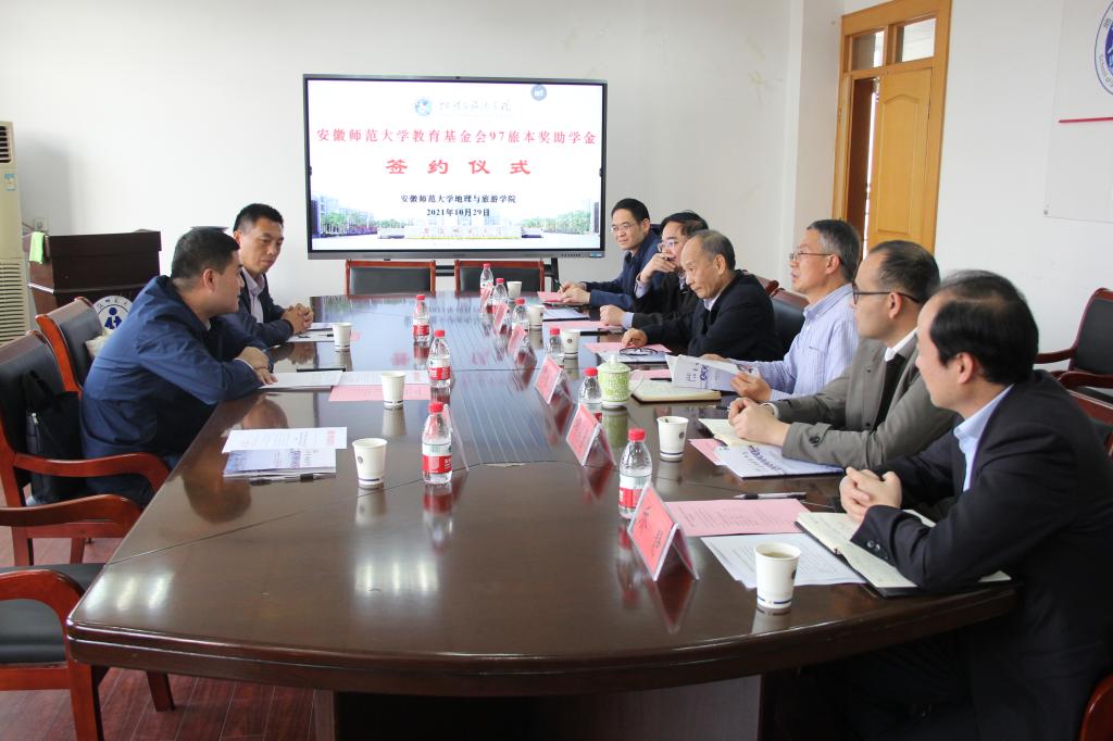本网讯(565net必赢客户端 吴思慧 彭媛媛)10月29日下午,安徽师范大学97旅本奖助学金二期签约仪式在565net必赢客户端行政楼四楼会议室举行。我校1997级旅游管理专业本科班校友代表窦贤琨、张启全、尹寿兵,校教育基金会秘书长贡植斌、校学生工作处副处长项家春、565net必赢客户端党委书记贾冠忠、院长苏勤、校教育基金会秘书苏军等出席签约仪式,仪式由院党委副书记乔静主持。