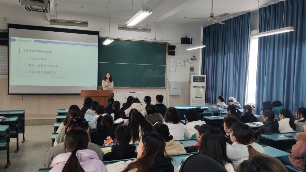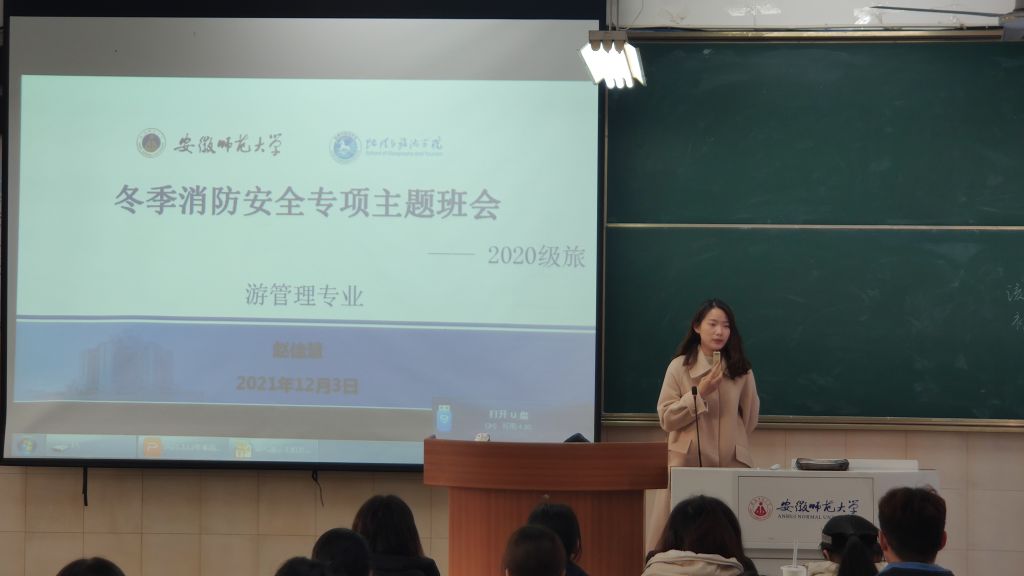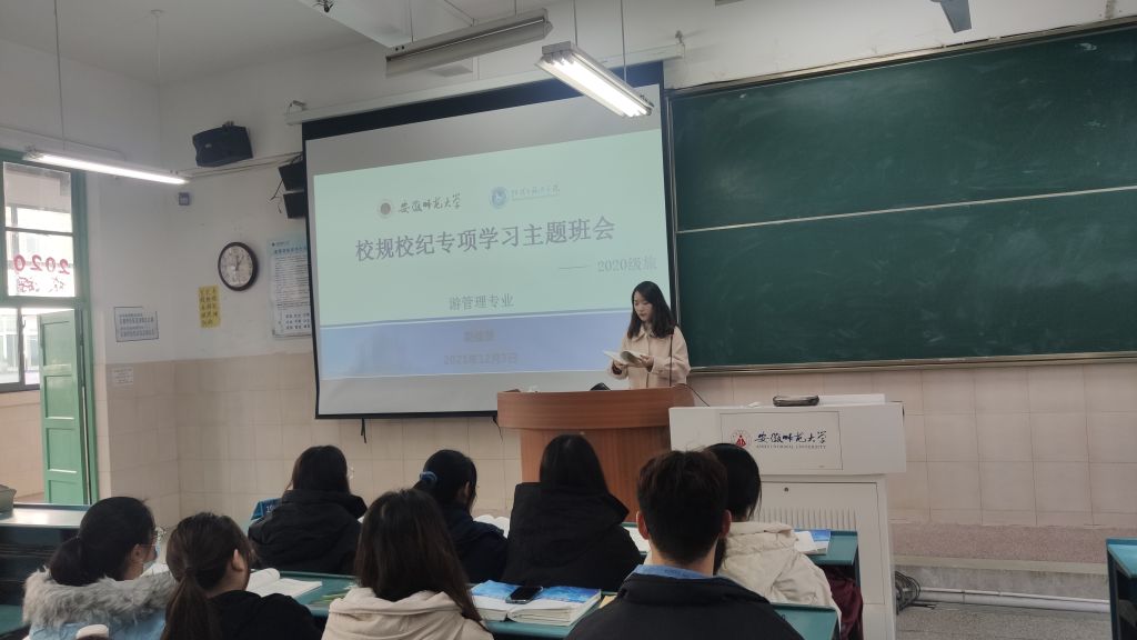 班会伊始,赵佳慧先是列举了多项冬季常见的消防安全隐患,如:宿舍火灾隐患、教室和实验室火灾隐患、违规电器与违规用电行为等。同时结合其他高校寝室由于违规用电而引发火灾的真实案例,向全体同学阐明寝室用电安全的重要性,要求同学们要严格遵照学校的相关消防安全要求。班会第二阶段,赵佳慧带领全体同学重温校规校纪,重点学习了《安徽师范大学学生公寓管理规定(修订)》、《疫情防控常态化下学生日常管理规定(暂行)》、《安徽师范大学学生宿舍消防安全管理规定》、《安徽师范大学学生违纪处分规定(修订)》等文件,特别强调同学们要严守“四项禁令”底线:严禁擅自离校;严禁私自租房;严禁晚归不归;严禁违规电器。班会的最后,赵佳慧就近期寝室检查结果再次重申要注意宿舍日常卫生,保持宿舍内部环境干净整洁,禁止在宿舍抽烟喝酒打牌。同时提醒同学们注意保护自身财产安全,离开寝室注意锁门,在疫情防控常态化的工作下,遵守“非必要不出市、“非必须不离不出省”相关要求。