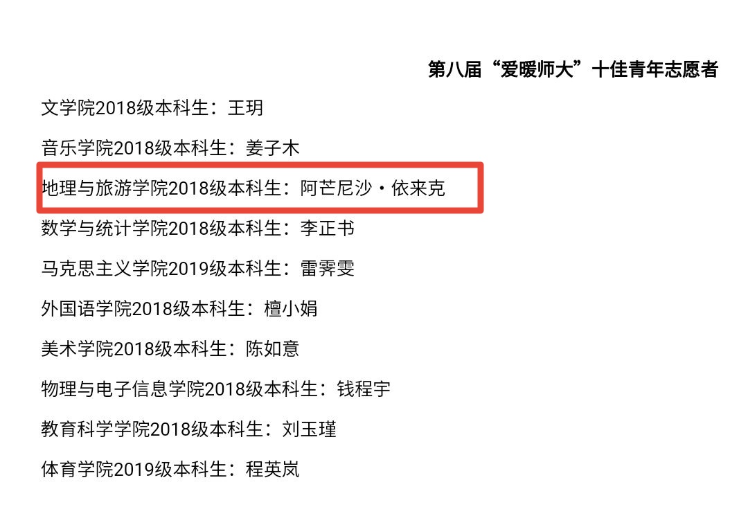 作为党员,作为新疆生,作为师范生,阿芒尼沙同学不断追求卓越,争做全面发展排头兵。参加校“党建+石榴籽工程”培训班、义务支教、爱心敬老、无偿献血等志愿活动,用文明礼仪为美丽师大建设贡献力量;学业成绩优良,获多项奖学金,教育实习期间,用心上好每一节课,用专业服务社会;在全国第十一届少数民族传统运动会以优异成绩获省部级以上奖励近10项;学生干部任职期间,多次组织心理健康、理想信念教育等校级活动。