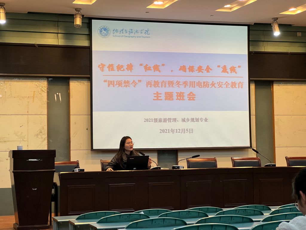 为教育引导学生自觉遵守学校管理规定,增强防火意识、规范用电行为,确保冬季学生在校安全。12月5日晚,565net必赢客户端2021级城乡规划、旅游管理专业在实验楼101报告厅开展了“四项禁令”再教育暨攻击防火用电安全教育主题班会。班会由辅导员韦银艳主持。