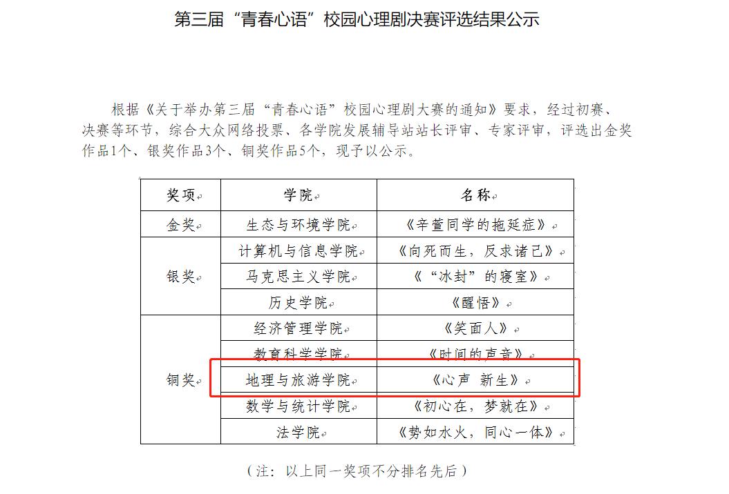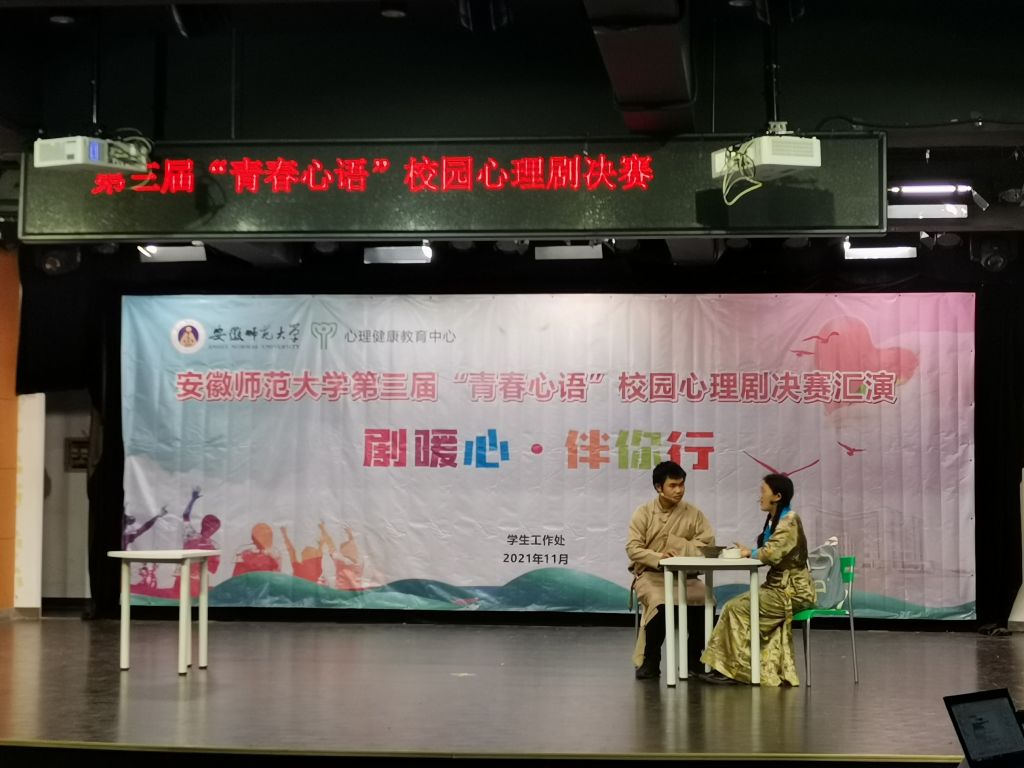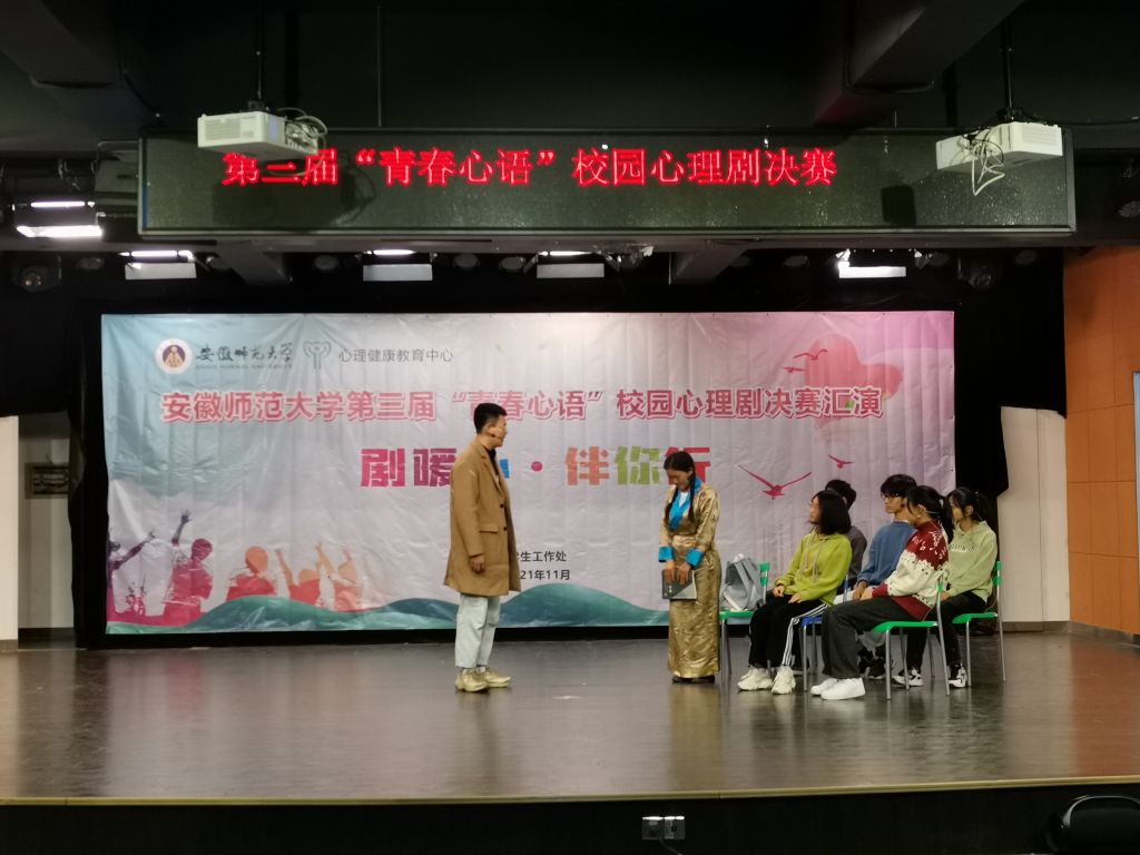为进一步推动大学生心理健康教育工作,营造校园心理健康文化氛围,引领大学生关注自我成长,增强学生心理维护意识,提升学生心理健康品质,第三届心理情景剧大赛于今年11月21日在安徽师范大学花津校区团委多功能报告厅举办。由565net必赢客户端辅导员齐小学指导,21级地理科学(师范)专业米玛卓玛、曹雅、19级地理科学(师范)陈帅冰、刘曦博等代表必赢参加比赛,最终,必赢作品《心声 新生》取得大赛铜奖的好成绩。