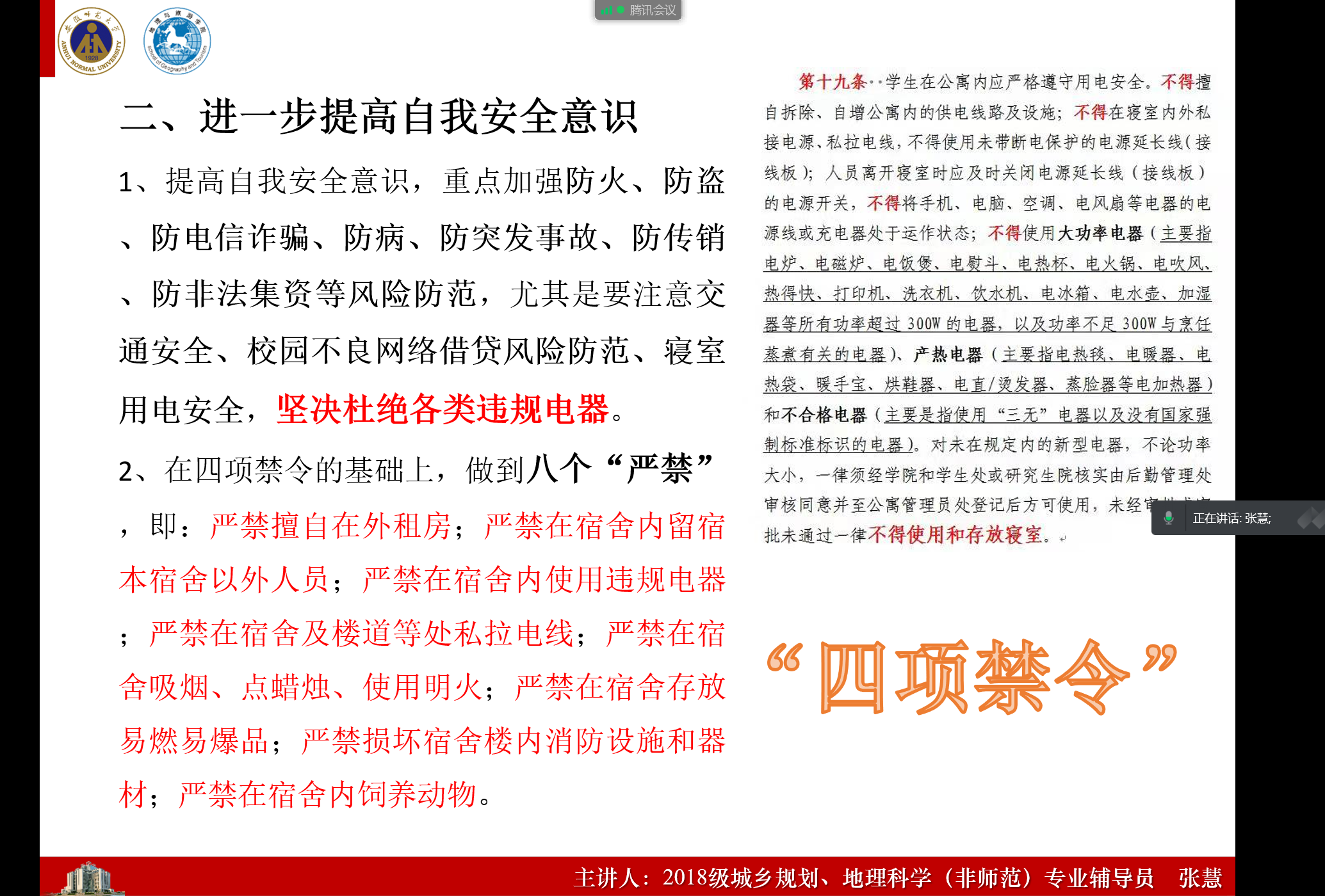 自我安全意识要提高。冬季是疾病与火灾的高发期,年底也容易出现诈骗及交通拥堵等现象,张慧结合相关案例重点为大家讲解了防火、防盗、防电信诈骗、防病、防传销等,并进一步强调了交通安全、寝室用电安全和网络借贷风险防范。张慧通过提问的方式,再次强调了“四项禁令”,并以此为基础,进行了八个“严禁”教育,她以最新的处分通报警示同学,要求同学们做好自己的同时成为他人的监督员。