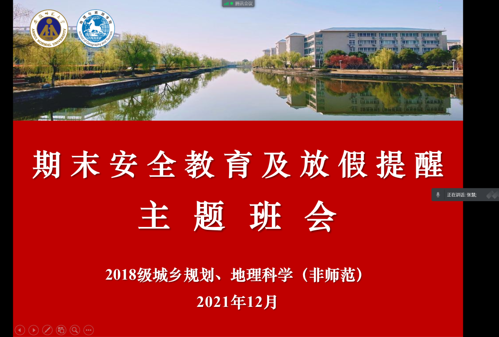(本网讯 张慧)为做好期末安全教育,增强学生安全防范意识,1227日晚上7点,2018级城乡规划及地理科学(非师范)专业在腾讯会议室召开期末安全教育及放假提醒主题班会。会议由辅导员张慧主持,2018级城乡规划及地理科学(非师范)专业全体同学参与会议。