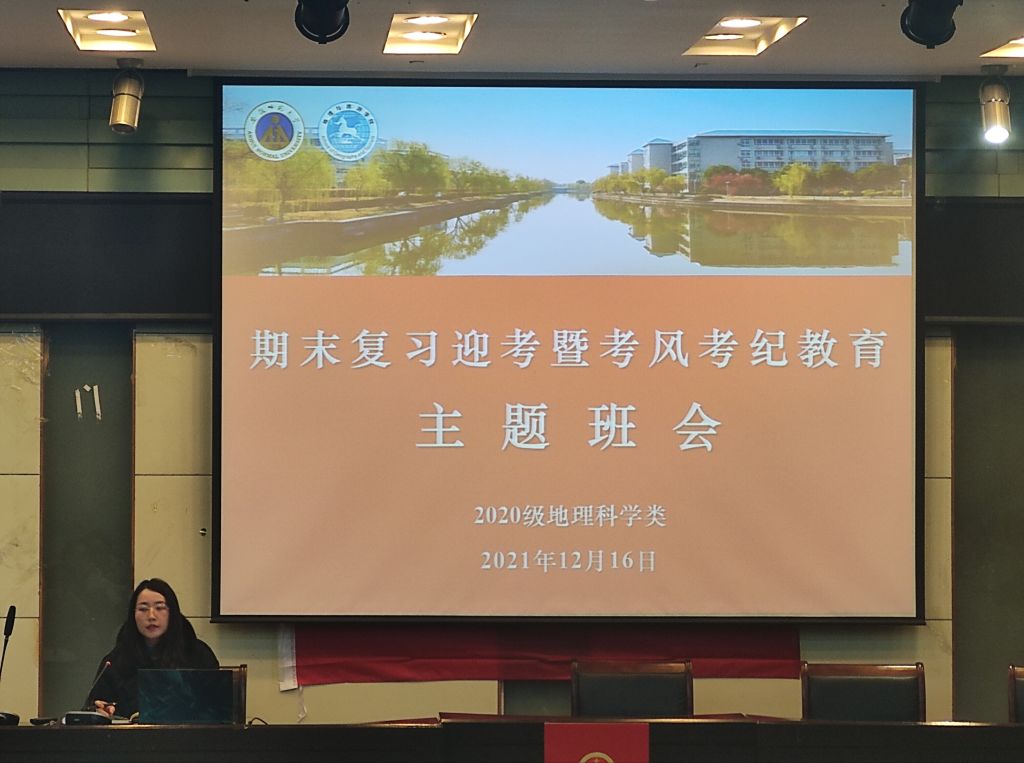 2021年12月16日,2020级地理类各专业召开考风考纪教育暨期末及假期安全教育主题班会。会议由彭媛媛主持,2020级地理类全体学生参会。