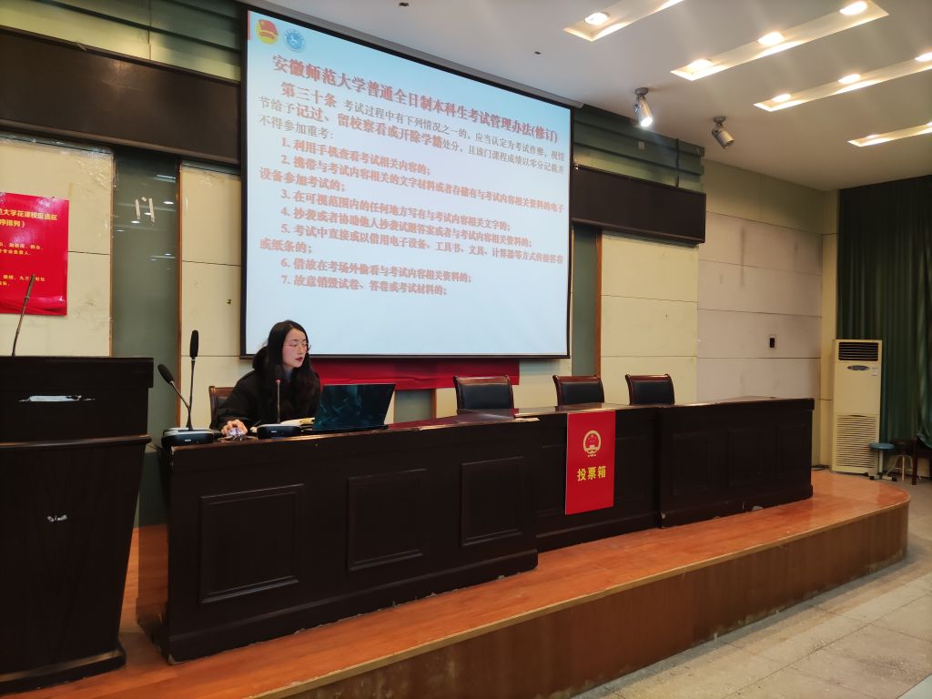 会议开始,彭媛媛强调即将开始四六级考试,提醒同学们遵守考场纪律,争取考过四六级。同时也通过解读相关法律条文、举例向同学们普及了在四六级考试之中作弊的严重性,切勿以身试法。因疫情原因考试不得不提前一周进行,希望同学们能够认真复习备考,做老师零作弊,争取实现零挂科。此外,还列出考还试的注意事项,殷切希望同学们能取得优异成绩。