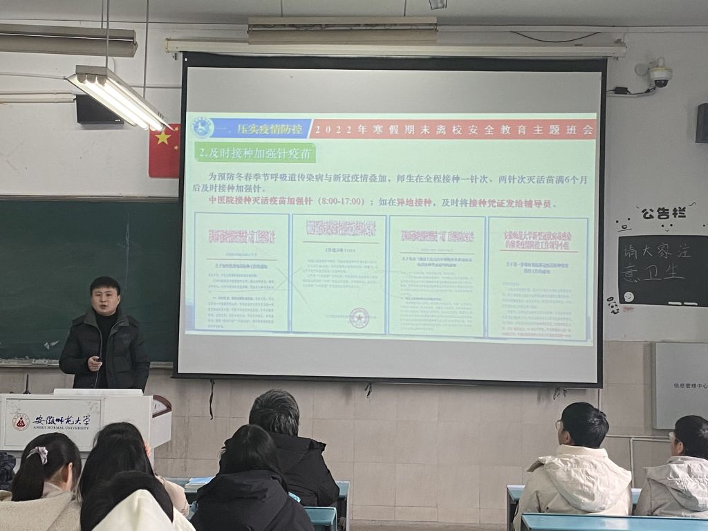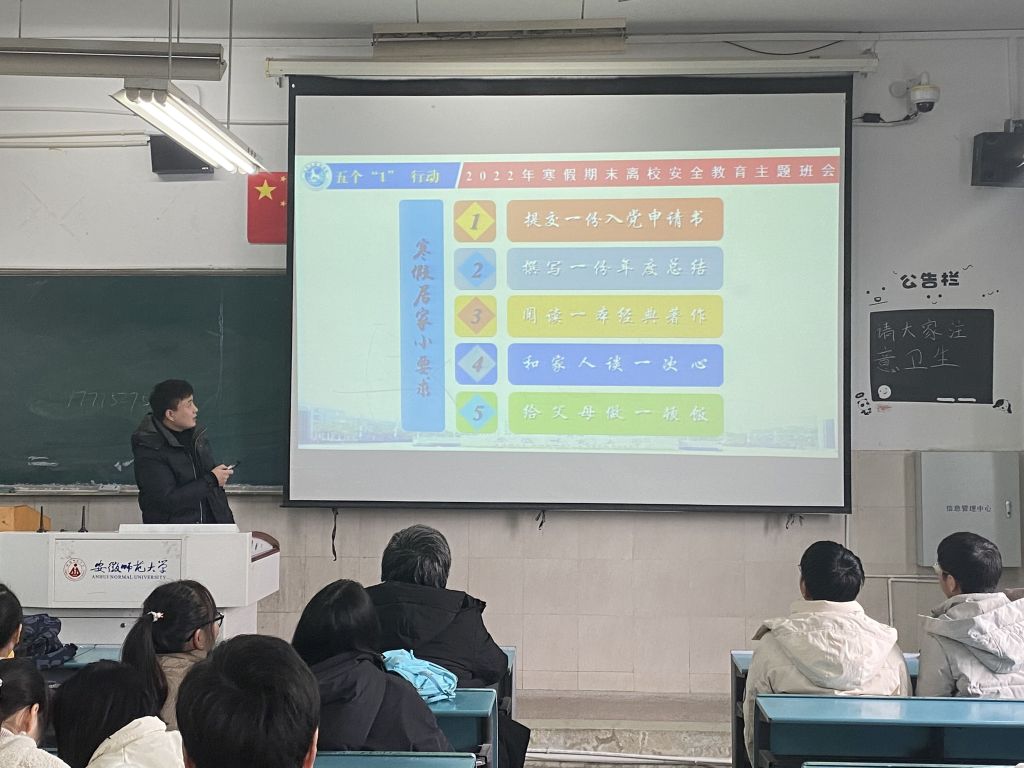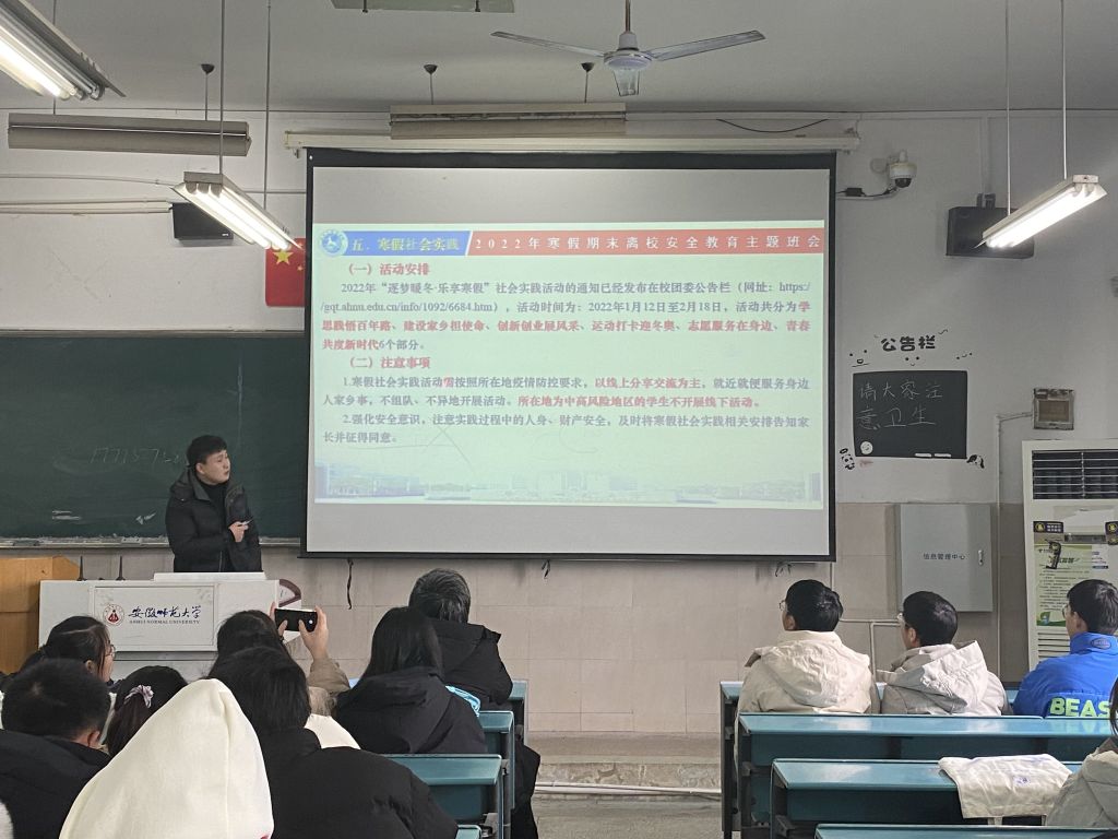 最后,刘少杰就关于寒假放假的相关信息进行了通报和提醒,对离校前的请假要求和离寝前的准备工作为同学们做详细说明,确保所有同学们安全离校,安全到家。同时,刘少杰提醒大家要充分利用寒假时间,主动学习、多与家人相处,在保证安全的前提下积极进行社会实践,丰富自己的假期生活。