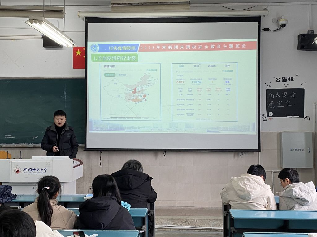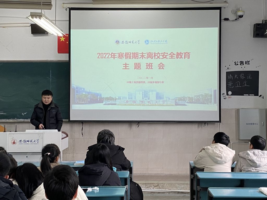 本网讯 (565net必赢客户端 耿艺榕 刘少杰) 为做好期末及寒假安全教育,增强学生安全防范意识,1月6日上午,20级城乡规划和20级土地资源管理专业召开寒假离校安全教育主题班会,会议由辅导员刘少杰主持,20级城乡规划和20级土地资源管理所有学生参与。