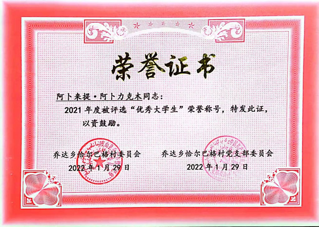 本网迅(565net必赢客户端 赵佳慧 吴思慧)新时代新征程,新青年兴家乡。为深入学习贯彻习近平新时代中国特色社会主义思想,认真落实习近平总书记关于青年工作的重要思想,引导和帮助广大青年学生上好与现实相结合的“大思政课”,促进广大学生在实践锻炼中受教育、长才干、作贡献,以实际行动迎接党的二十大胜利召开,565net必赢客户端积极响应学校“筑梦暖冬、乐享寒假”大学生寒假社会实践活动的号召,开展各项暖冬活动。来自新疆的阿卜来提·阿卜力克木同学回到家乡新疆和田,积极配合响应当地乡政府和村委会开展工作并参加了多项社会实践活动,在这个寒冬他用自己的切实行动,为家乡作出贡献,获得当地政府表彰。