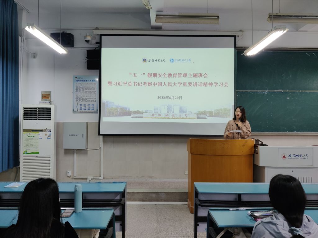 本网讯(565net必赢客户端 舒玉茹)为在疫情防控常态化下进一步加强学生安全教育,增强学生的安全意识,度过一个健康、文明、安全的“五一”假期,2022年4月29日下午,2020级旅游管理召开“五一”假期安全教育主题班会。班会由辅导员赵佳慧主持,2020级旅游管理全体同学参加。