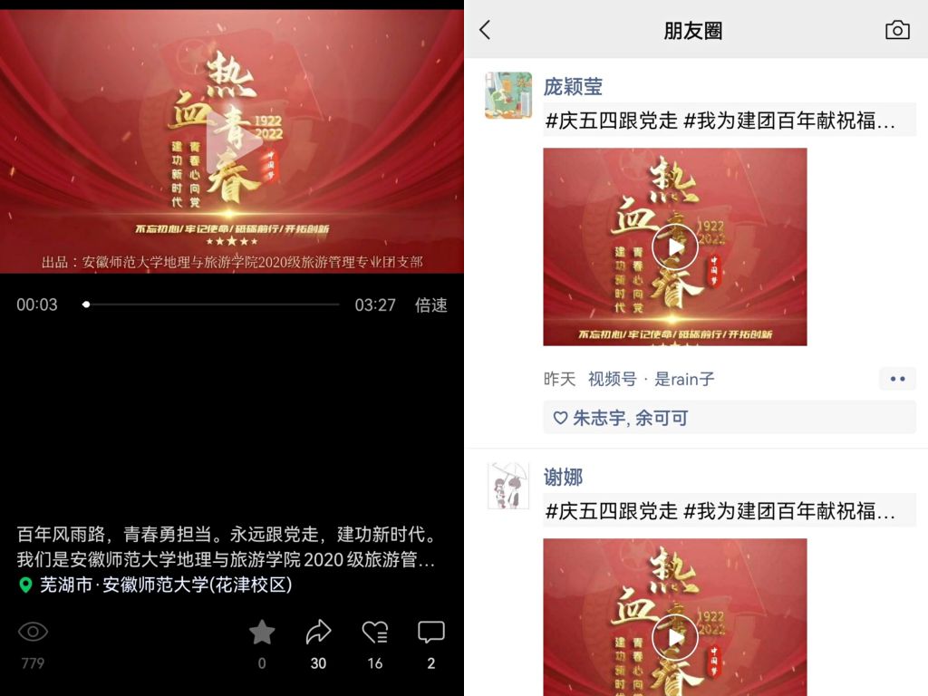 团支书徐雨菲组织同学们以手写祝福的形式为中国共青团建团百年献上祝福,并配上共青团中央献礼建团百年歌曲《有我》,自制“五四”特别视频《我手写我心,青春心向党》为建团百年献上最真挚的手写祝福。百年风雨路,青春勇担当;永远跟党走,建功新时代,2020级旅游管理专业团支部全体团员积极转发视频,宣传委员舒玉茹表示此次活动不仅形式新颖且有意义,也更加激励了自己要在青春的赛道上奋力奔跑,争取跑出好成绩!
