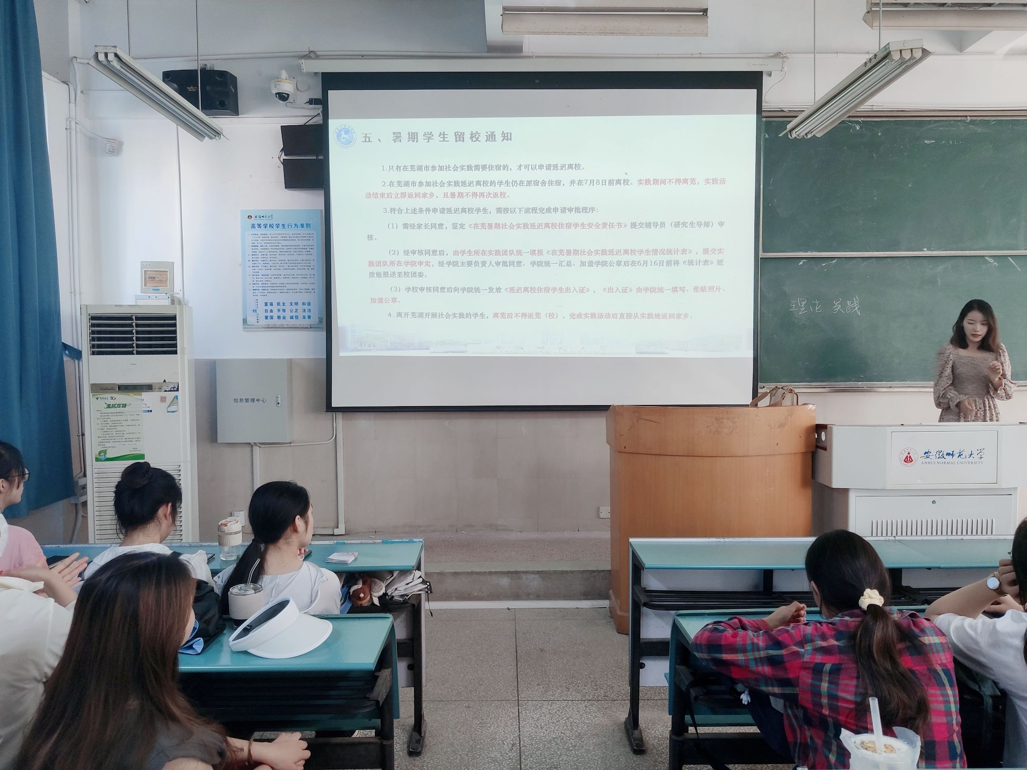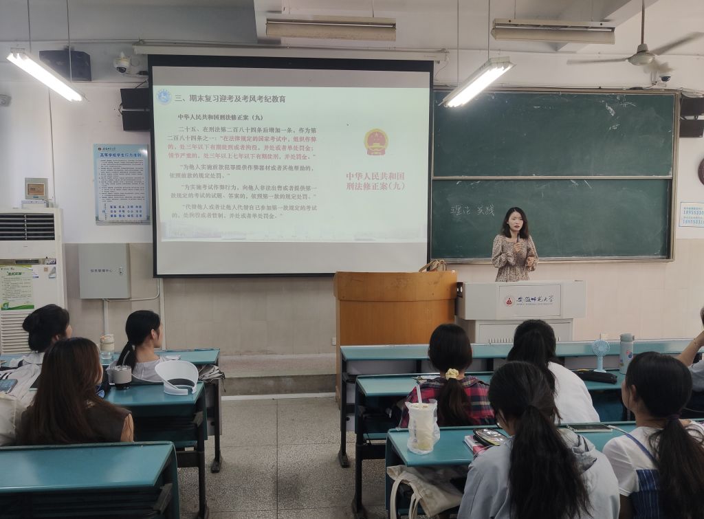 此次班会主要围绕“诚信考试”和“安全教育”两大部分展开。会议伊始,赵佳慧便针对期末迎考问题进行了两方面的强调。一方面,赵佳慧提醒同学们要做到合理安排复习时间、科学规划复习节奏,积极迎考。此外,赵佳慧一再强调同学们要严守诚信考试底线,筑牢诚信考试防线。紧接着,赵佳慧从严守学校“四项禁令”切入,围绕“期末安全教育”向同学们做出多方面提醒。赵佳慧重点强调同学们要重视疫情防控安全、食品安全、寝室防火用电安全、交通安全、网络安全、防电信诈骗等,特别提醒同学们在暑期社会实践期间要注意人身财产安全,另外夏季到来,要远离危险水域,注意防溺水。最后,赵佳慧为同学们解答了暑期留校相关问题,同学们需严格遵守留校申请审批流程,同时,留校期间仍需遵守学校各项制度规定,共创文明安全的校园环境。