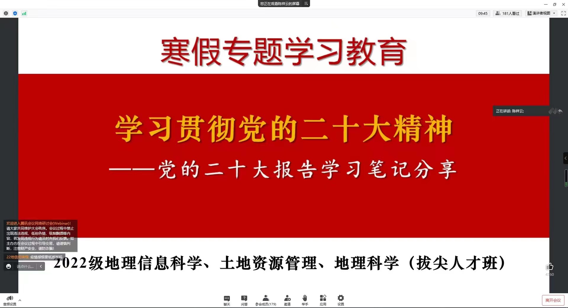 本网讯(顾冉 陈祥云)近日,2022级地理信息科学、土地资源管理、地理科学(拔尖人才班)专业开展学习宣传贯彻党的二十大精神专题学习线上团日活动。2022级地理信息科学1班、土地资源管理专业1班、地理科学(拔尖人才班)1班团支部全体同学线上参加,会议由辅导员陈祥云主持。