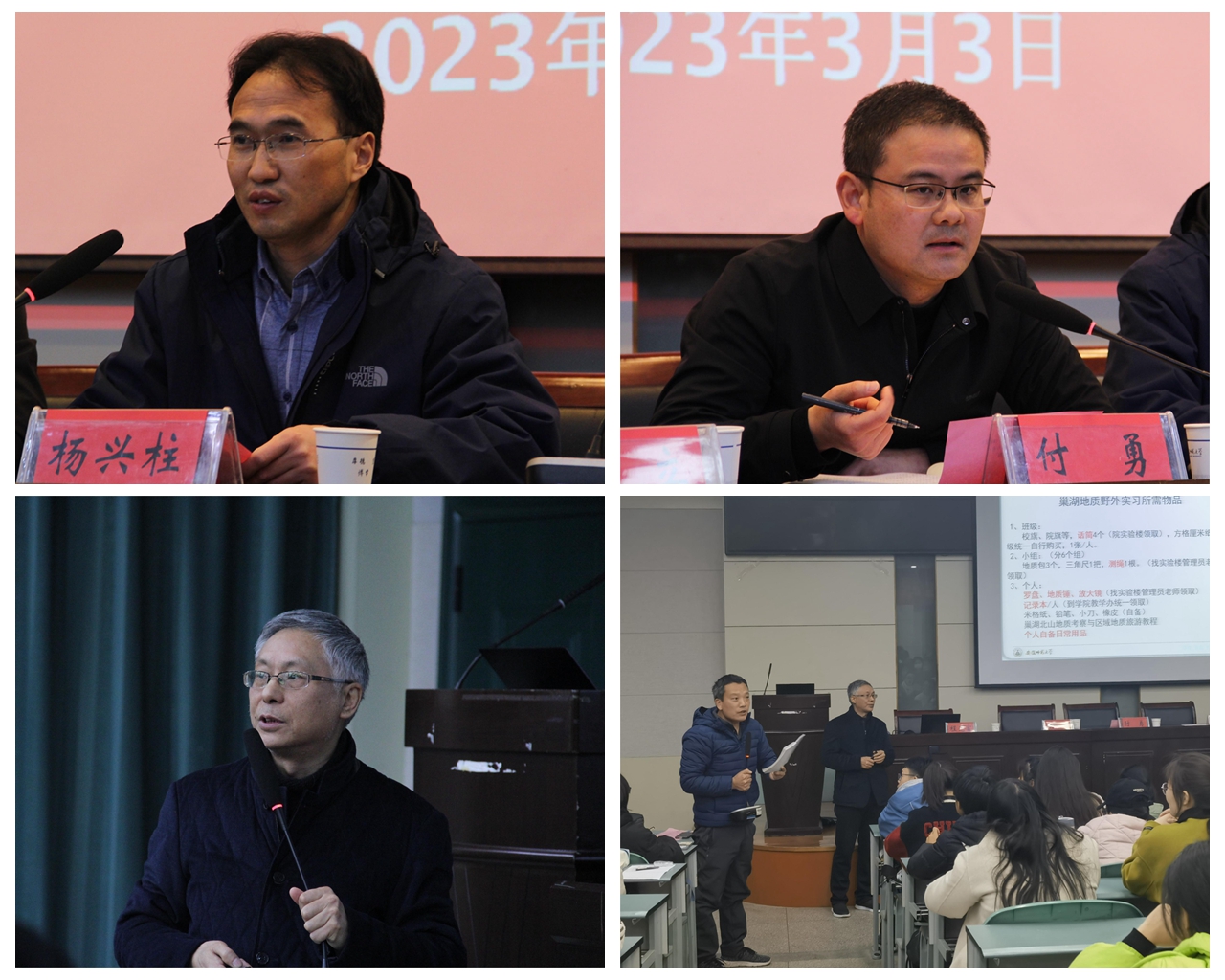 会上,杨兴柱号召同学们要珍惜实习机会、保持初心,不断提升专业素养;要践行知行合一、将理论知识转化为实践,做到多听、多看、多问、多思考;要培养团队合作精神、提高综合素养,要吃苦耐劳,善于沟通,互帮互助。付勇要求同学们要有安全意识,把健康安全放在第一位,及时反馈个人身体状况;要有纪律意识,按规定做好考勤工作,遵守实习纪律;要有形象意识,端正个人态度,注意言行举止,维护师大学子的形象。程先富从野外实习的目的与意义、野外实习的主要阶段、巢湖实习基本概况、地质学教学“圣地”和地质学科普“胜地”五个部分进行了授课,要求同学们做到“五勤”:腿勤、眼勤、手勤、脑勤、口勤。