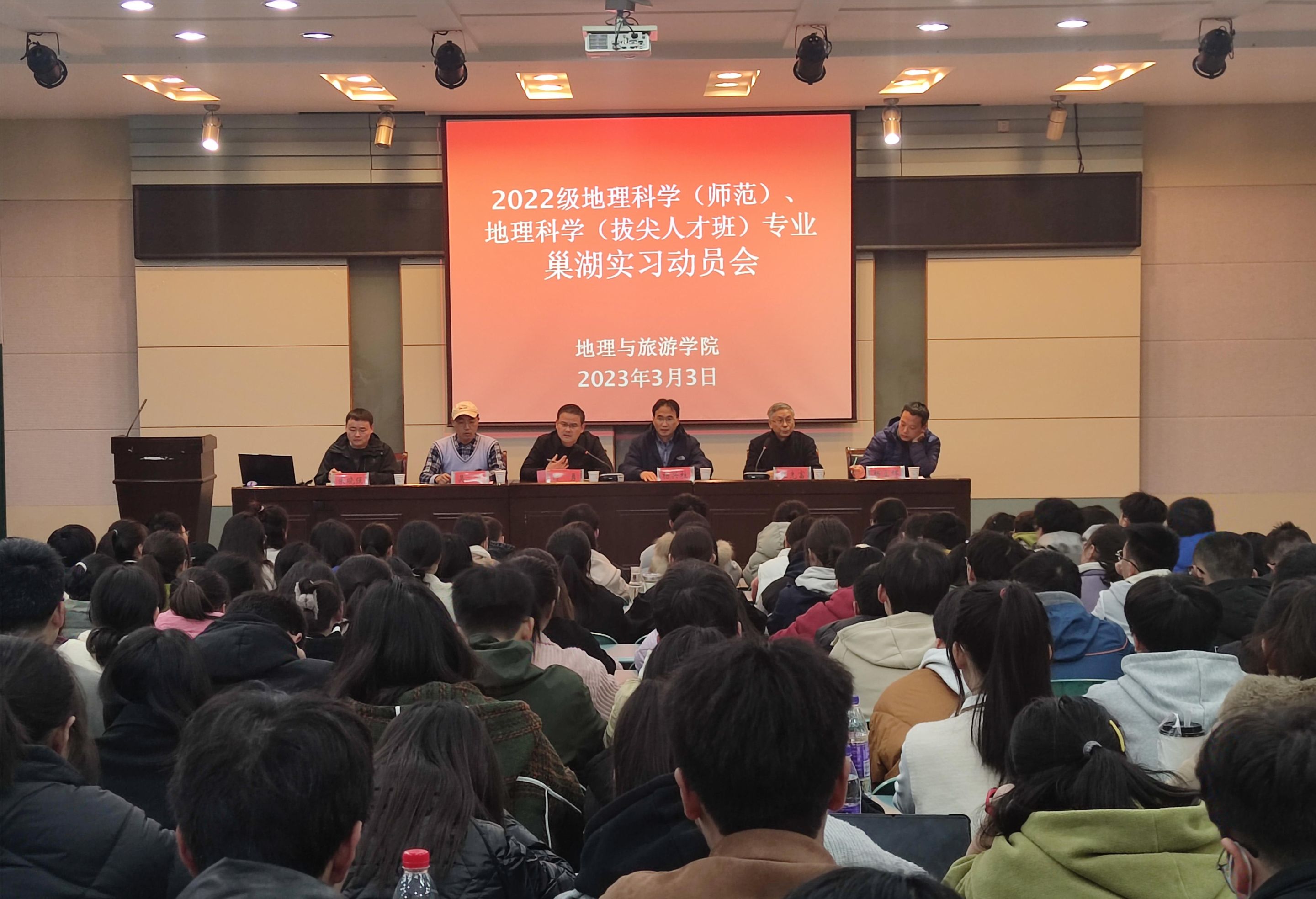 2023年3月3日晚,565net必赢客户端召开2022级地理科学(师范)、地理科学(拔尖人才班)专业巢湖实习动员大会,学院党委副书记付勇,副院长杨兴柱,实习指导老师程先富、吴立、杨立辉、朱晓强以及辅导员陈祥云、操晶晶出席会议,2022级地理科学(师范)、地理科学(拔尖人才班)专业全体学生参加会议,会议由程先富教授主持。