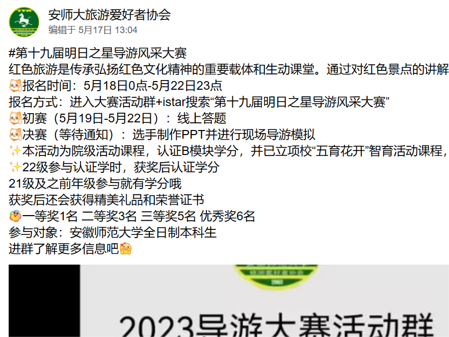 据悉,“明日之星”导游风采大赛是旅游爱好者协会的品牌活动,每年5—6月举办。本次导游大赛促使学生间进行专业技能与思想感情的交流,通过对红色景区的讲解,厚植师大学子的爱国情怀,让更多的人了解红色旅游,传承民族精神。