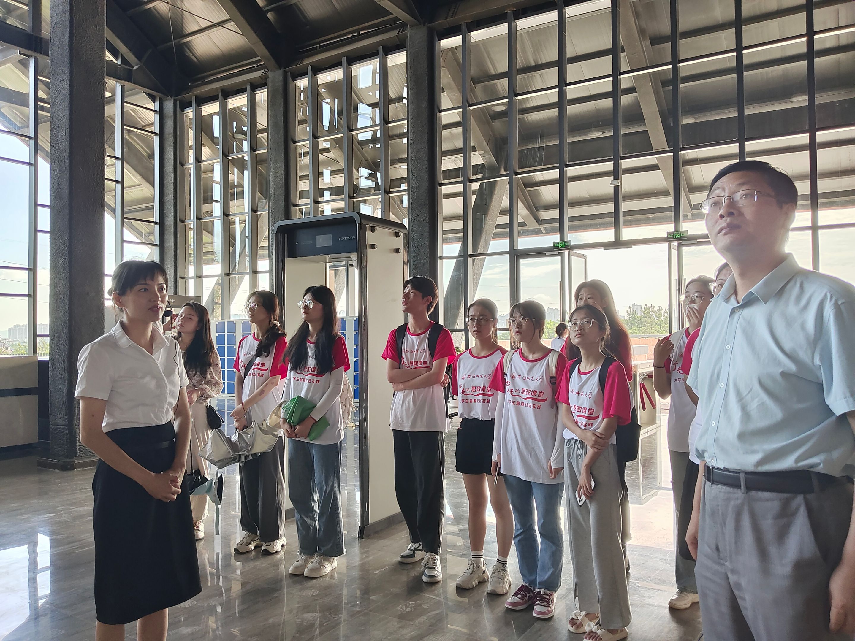 走进炼铜有术展厅,现代的声电音像技术向我们全景展示了古铜矿从开采冶炼全过程,从铜绿山深处埋藏的矿石,化作炙热的金色铜液,再浇筑成厚重神秘的各式青铜器物,队员们彷佛魂穿千载,亲历古人的劳动与智慧。一路上杨老师让队员们多看,多听,多记,多想,将实践中的考察感悟与自身的缜密思考相结合,探寻青铜旅游活化之路。