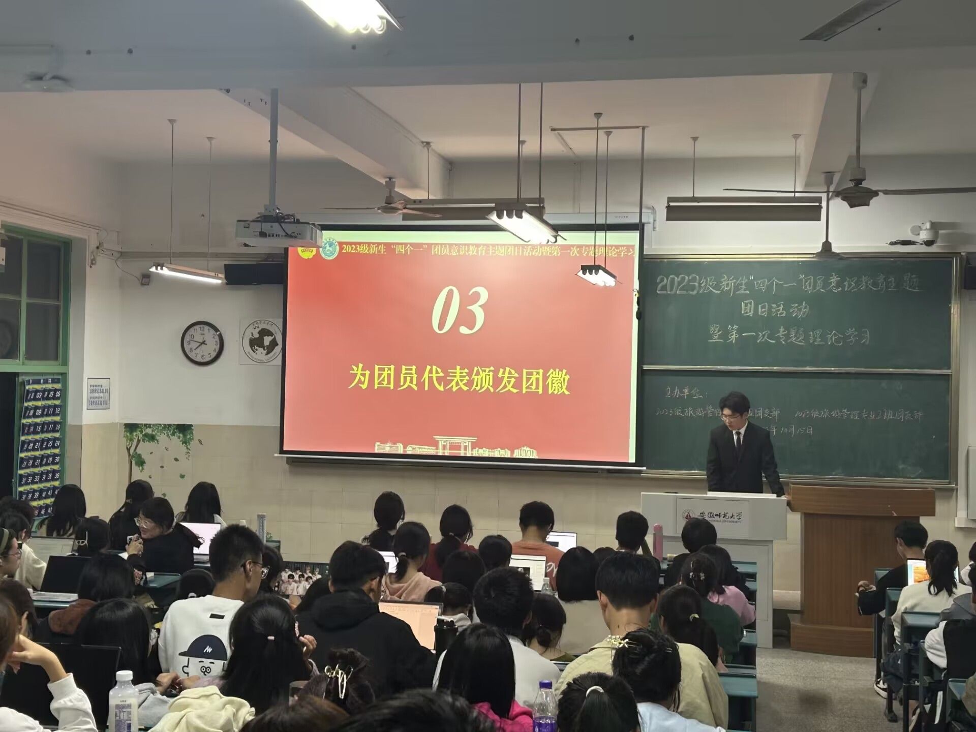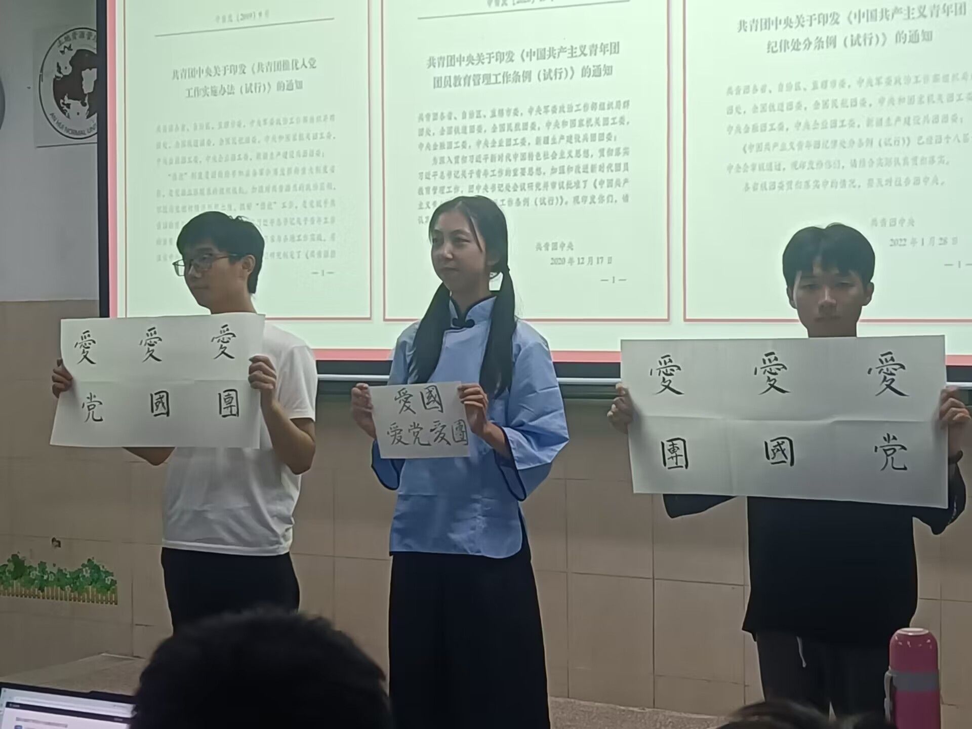 学习结束后,全体同学起立,齐声高歌,以洪亮的歌声响彻整个校园。歌声激荡着团结、进步和自豪的情感,彰显了同学们对祖国、对团组织和对学校的热爱之情。随后,活动来到了佩戴团徽的环节,代表团员们步伐坚定的走向讲台,在他们佩戴上团徽的那一刻,眼神中仿佛出现了光,充满着信心与力量,也充满着激情与活力。他们庄重地宣誓:我们将时刻与共青团同呼吸,与共青团共命运。