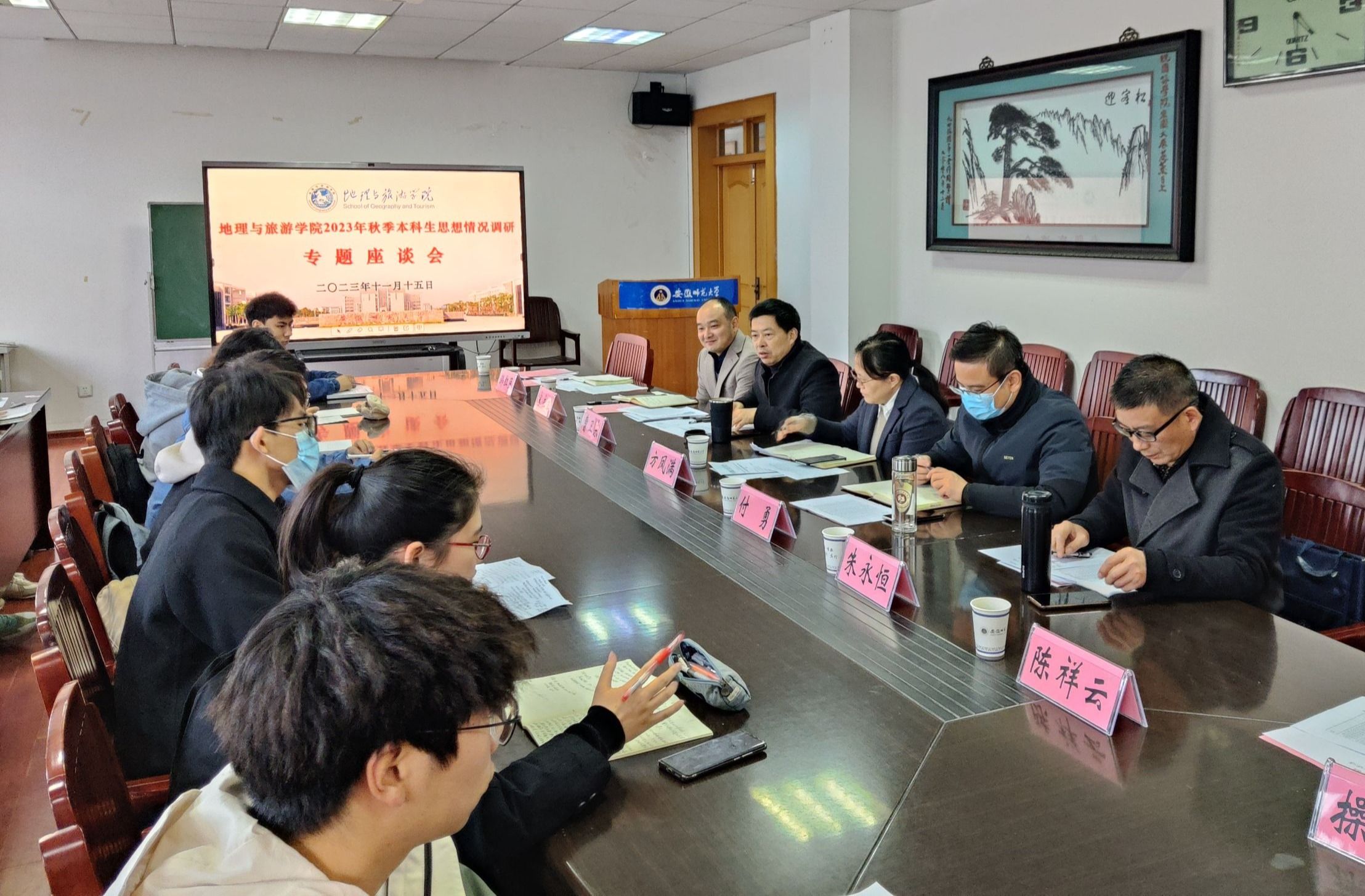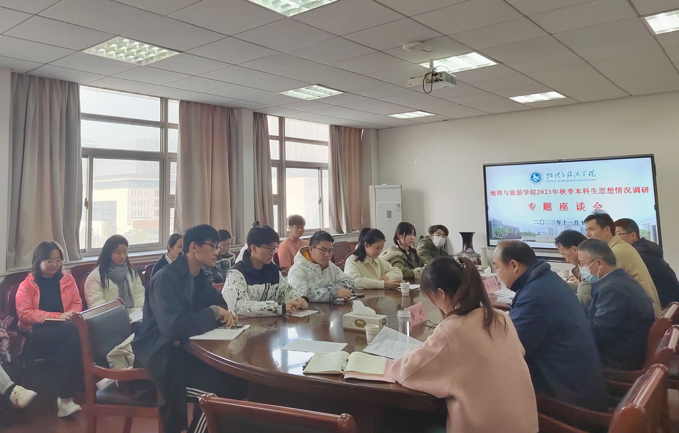为扎实推进时代新人铸魂育人工程,全面实施大学生护航行动计划,及时了解秋季学生思想状况,研究解决学生在思想、学习和生活等方面存在的实际问题,有针对性地做好教育管理和服务工作,11月15日下午,565net必赢客户端在学院行政楼举行2023年秋季本科生思想情况调研专题座谈会,座谈会根据专业划分为地理地信、旅游土地城规两个分会场。565net必赢客户端领导班子成员、各专业负责人、专兼职辅导员以及思政委员按专业分会场参加座谈会。