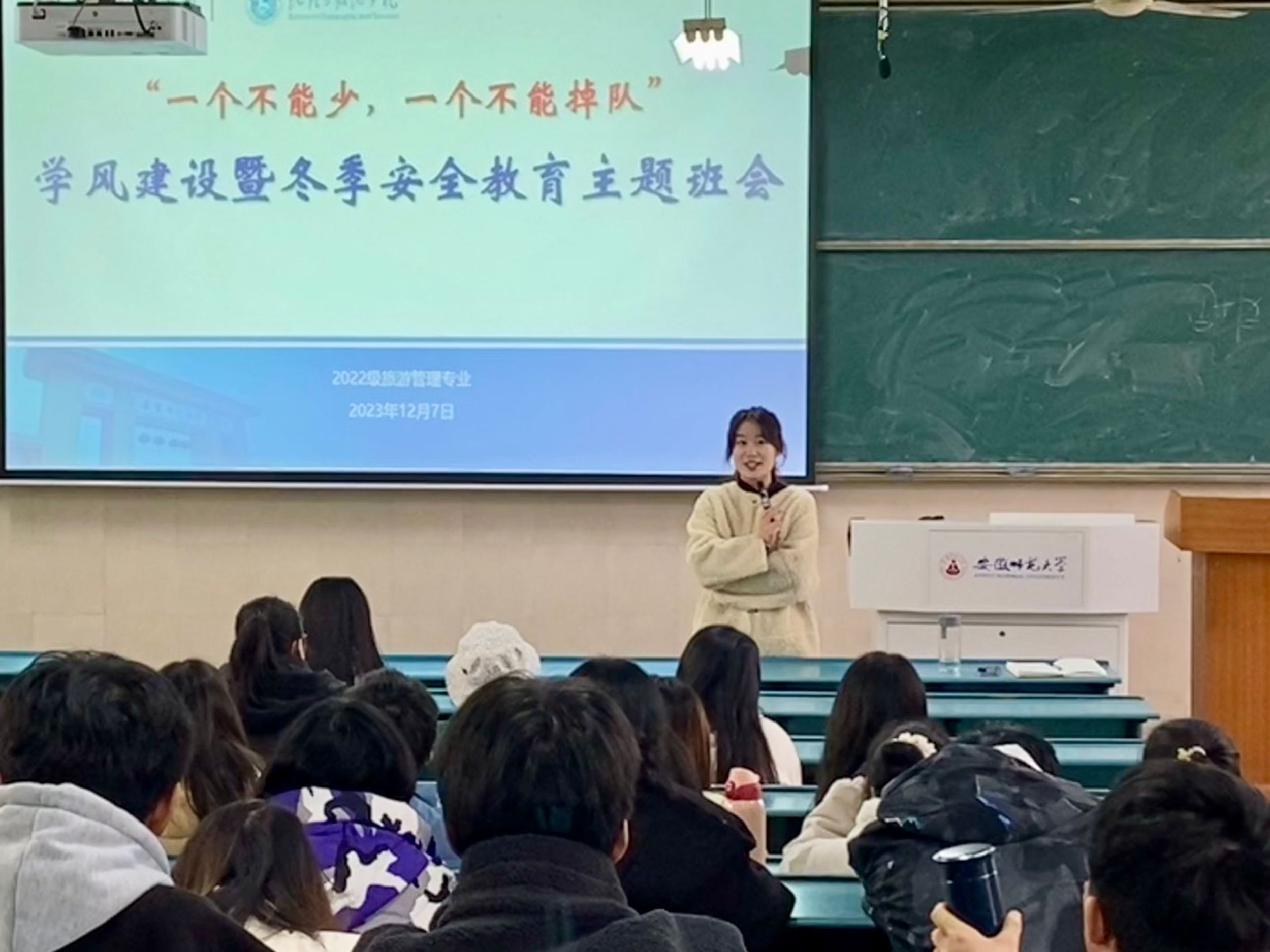 本网讯(李凯悦)12月7日上午,2022级旅游管理专业在行知楼4号楼101教室召开一个都不能少,一个都不要掉队”学风建设暨冬季安全教育主题班会,会议由辅导员谢园主持,旅游管理专业教师张伟、2020级旅游管理专业的陶栗、徐菁和2022级旅游管理专业全体学生参加。