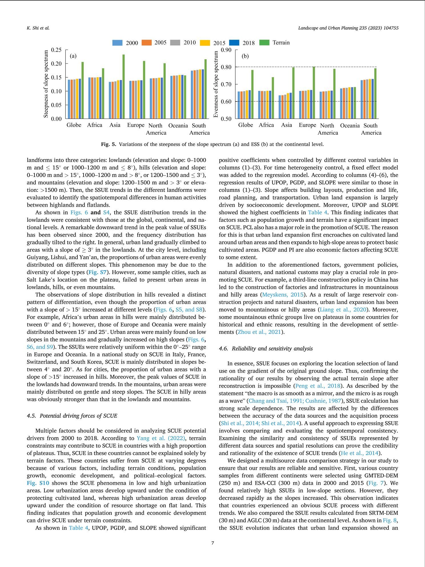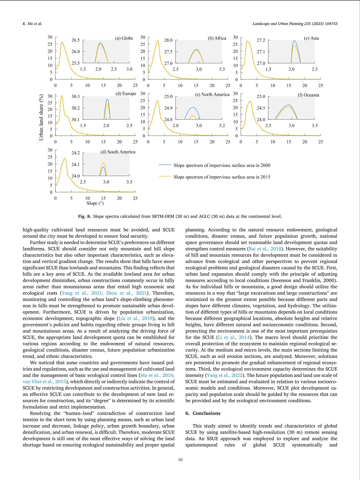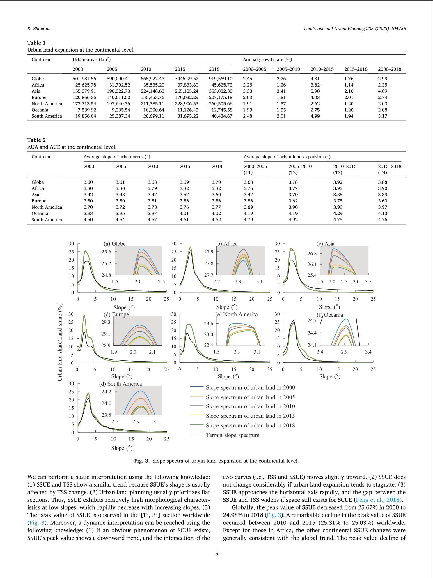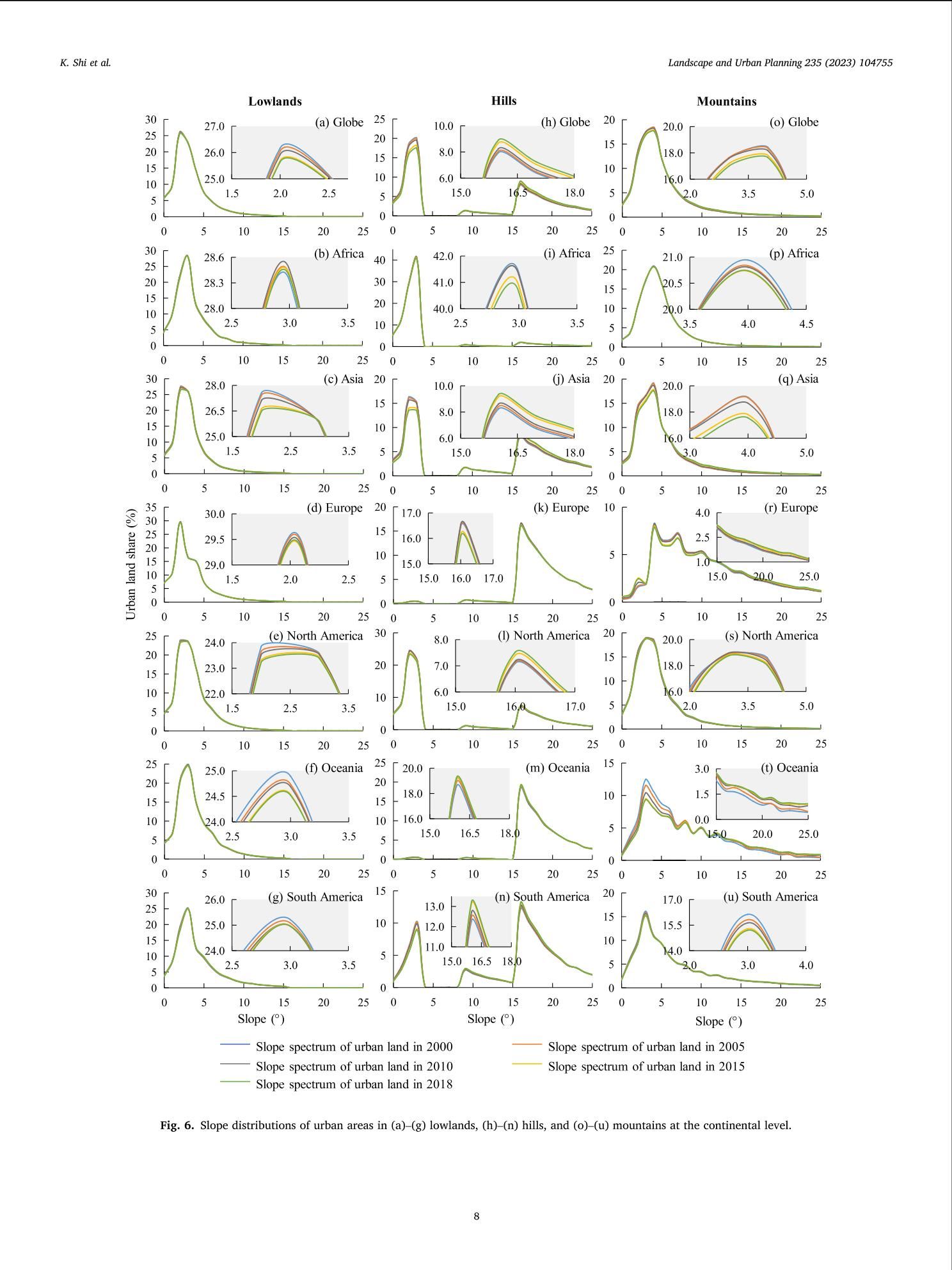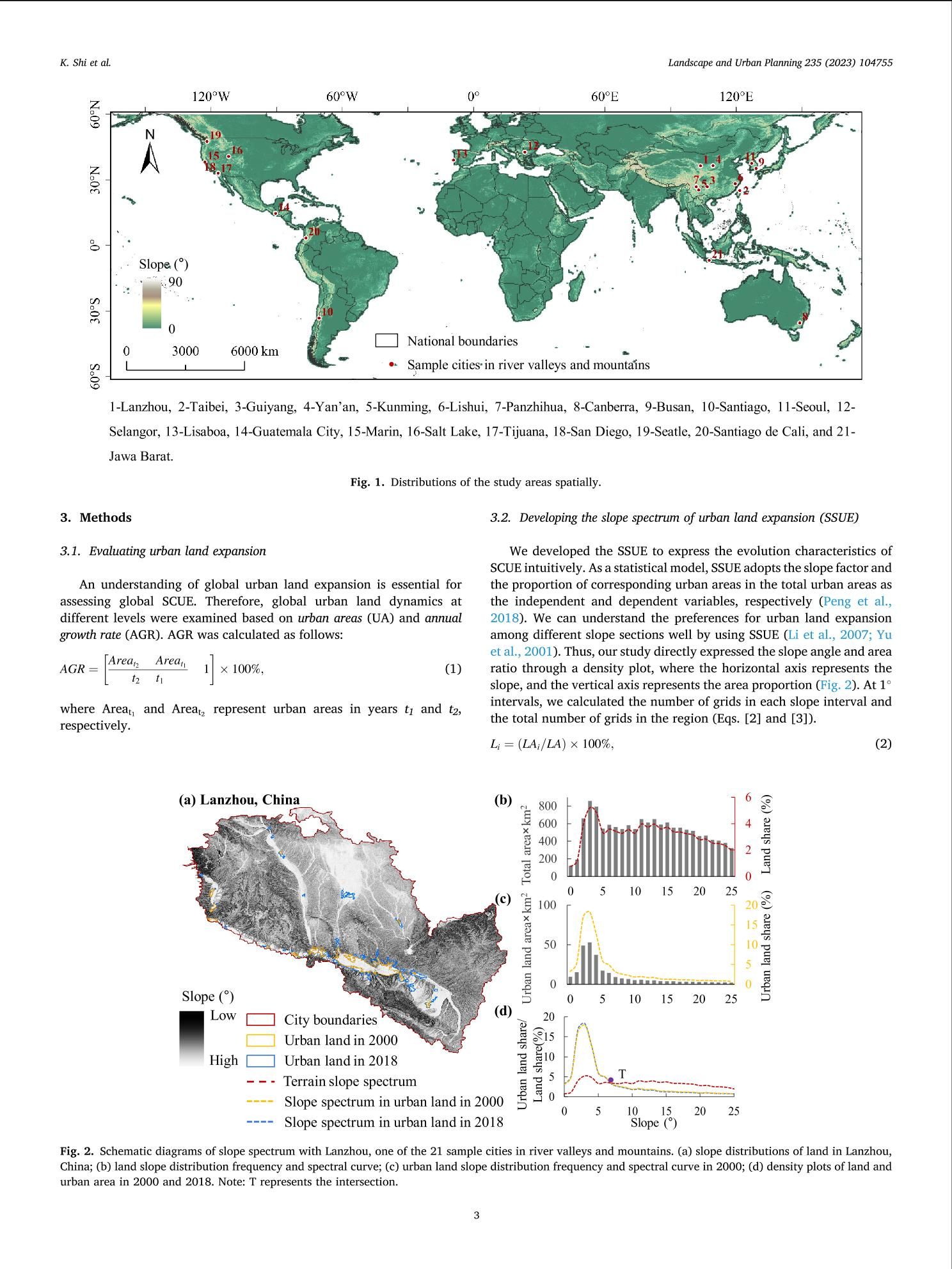 本文借助中高分辨率遥感影像,采用坡谱分析法,绘制与分析了全球不同尺度(包括大洲、国家以及多个典型山地丘陵与河谷城市)的地形坡谱曲线和城市用地坡谱曲线,证明了全球城市扩张存在广泛的爬坡趋势。研究可为全球山地城市化发展提供新的见解,服务于联合国2030年可持续发展目标进展评估。