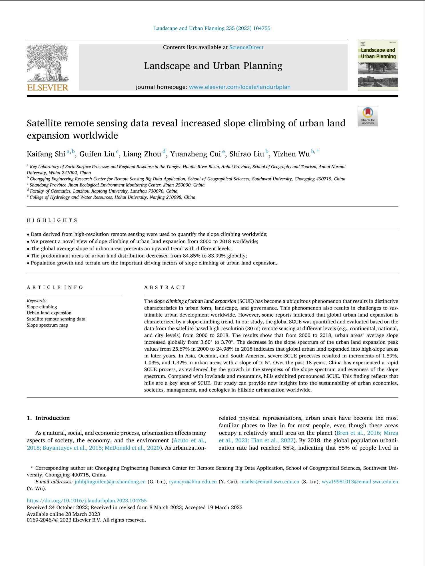 【科研硕果】Satellite remote sensing data reveal increased slope climbing of urban land expansion worldwide