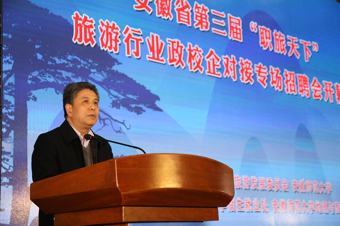 陆林在讲话中指出,旅游业作为国民经济战略性支柱产业,旅游发展工作的重中之重是要着力加强旅游基础理论、人才队伍、数据中心和平台建设,为旅游创新发展提供新支撑。陆林表示,作为全国较早、省内最早设置旅游专业本科和硕士点的高等教育单位,我校应发挥在旅游教学、科研、人才培养、社会服务和旅游文化传承创新等方面的作用和优势,以习近平新时代中国特色社会主义思想为指导,积极响应国家建设“世界旅游强国”的目标,强化人才兴旅,大力推进创新型高素质旅游人才队伍建设,强化政校企合作、创新人才培养和就业工作渠道,不断探索和创新旅游人才培养和就业工作路径。陆林充分肯定了举办“职旅天下”系列活动的意义,认为该项品牌活动是我校旅游类专业人才培养和就业工作的一项有益尝试,他希望到会嘉宾朋友能够依托这个平台充分交流,共同合作,将行业发展与专业建设相结合;参会的老师同学们能够依托这个平台开拓眼界,将理论与实践相结合;全省高校能够依托这个平台加强联络,树立品牌,共同为美好安徽和旅游强省建设发挥人才支撑、智力支撑和创新支撑的重要作用,为我省旅游业大步迈向优质旅游发展新时代做出了新的贡献。