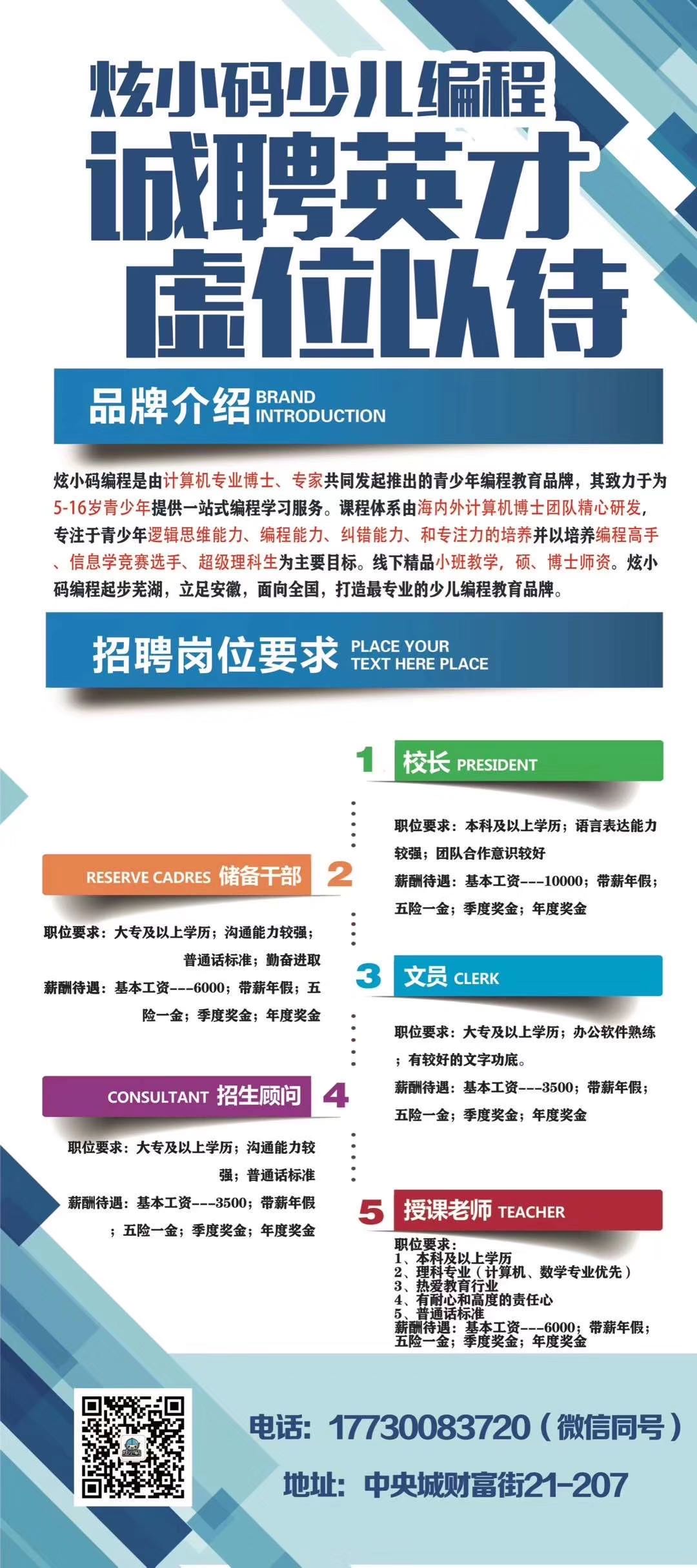 炫小码品牌介绍:炫小码编程是由计算机专业博士、专家共同发起推出的青少年编程教育品牌,其致力于为5-16岁青少年提供一站式编程学习服务。课程体系由海内外计算机博士团队精心研发,专注于青少年逻辑思维能力、编程能力、纠错能力、和专注力的培养并以培养编程高手、信息学竞赛选手、超级理科生为主要目标。线下精品小班教学,硕、博士师资。炫小码编程起步芜湖,立足安徽,面向全国,打造最专业的少儿编程教育品牌。