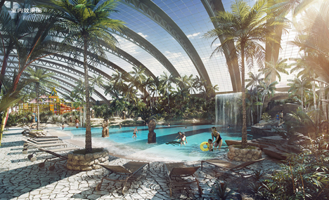 湘湖森泊项目由中央设施和度假屋区两大部分组成,总占地300亩,客房460间。中央设施是整个项目的核心,是一个集游乐、餐饮、休闲于一体的大型室内全天候水上综合乐园,建筑面积为52000平方米。
